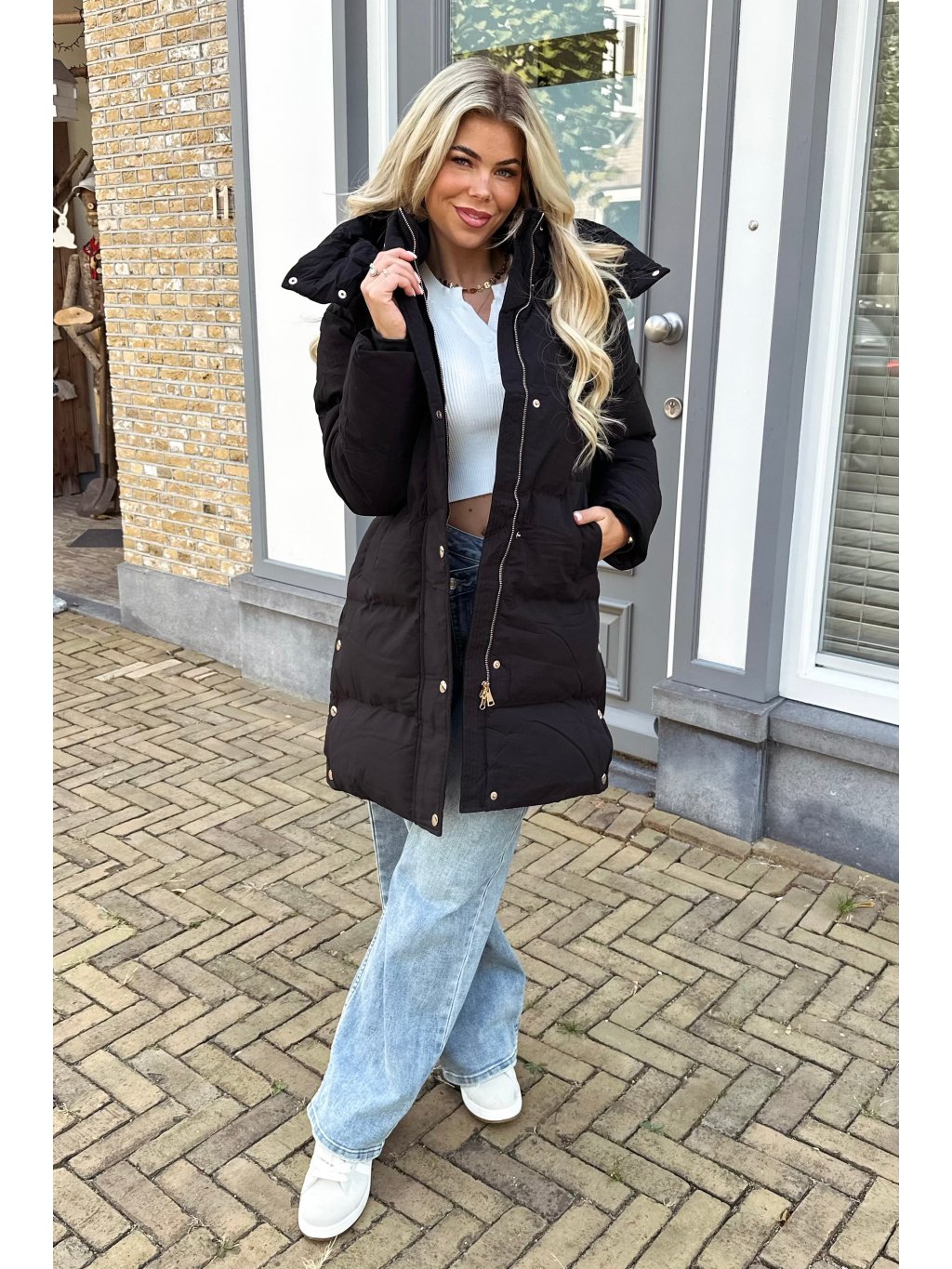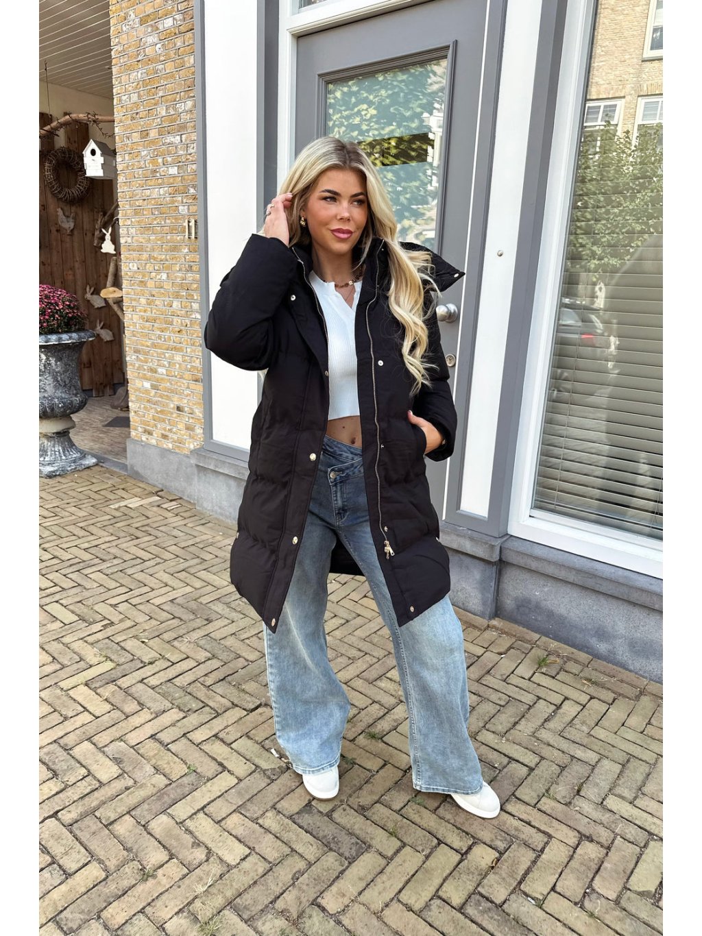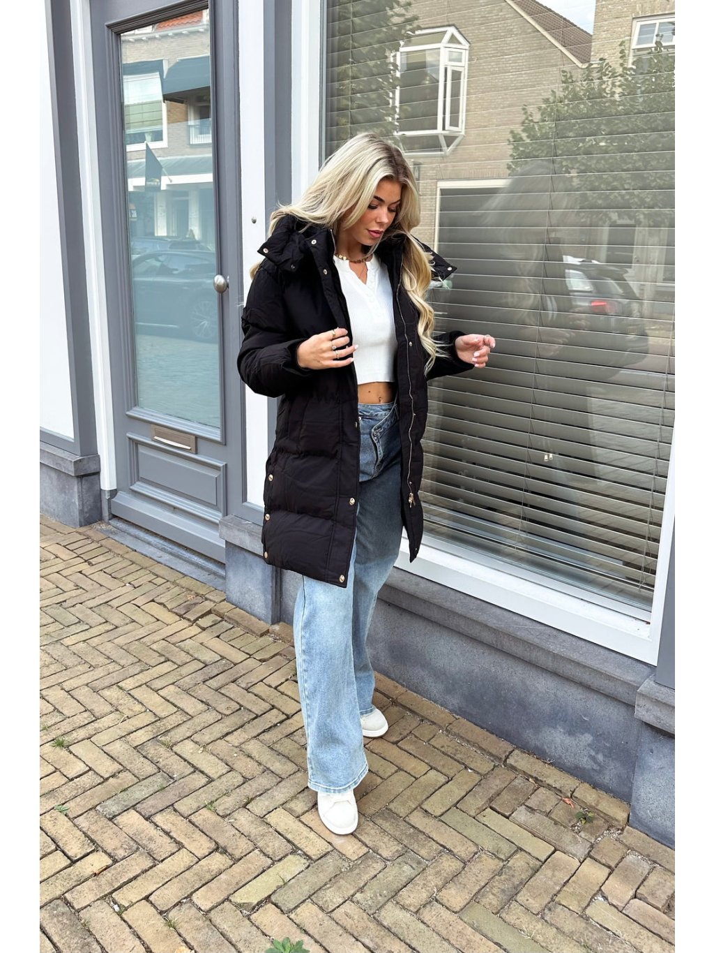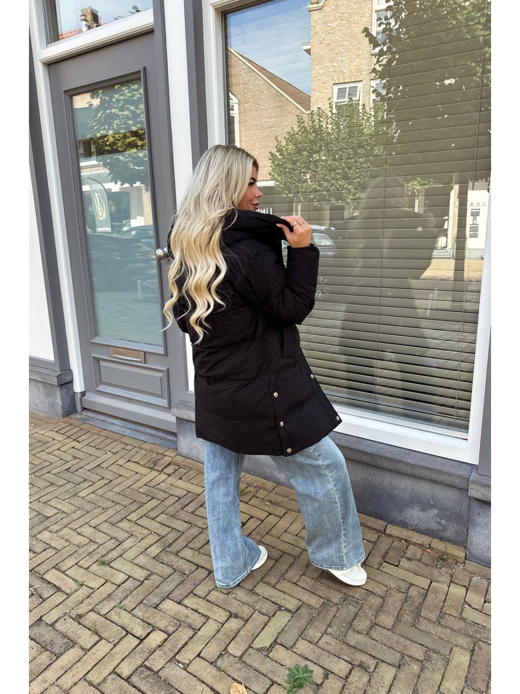Dámska zimná bunda v čiernej farbe • zateplená zimná bunda s veľkým golierom• v zadnej časti na golieri brand GUESS• zapínanie na viazanie• po oboch stranách...