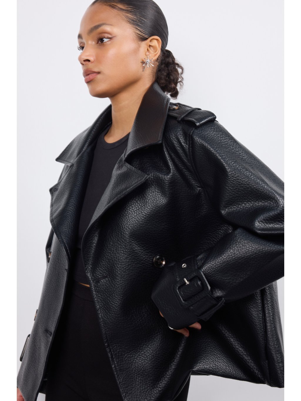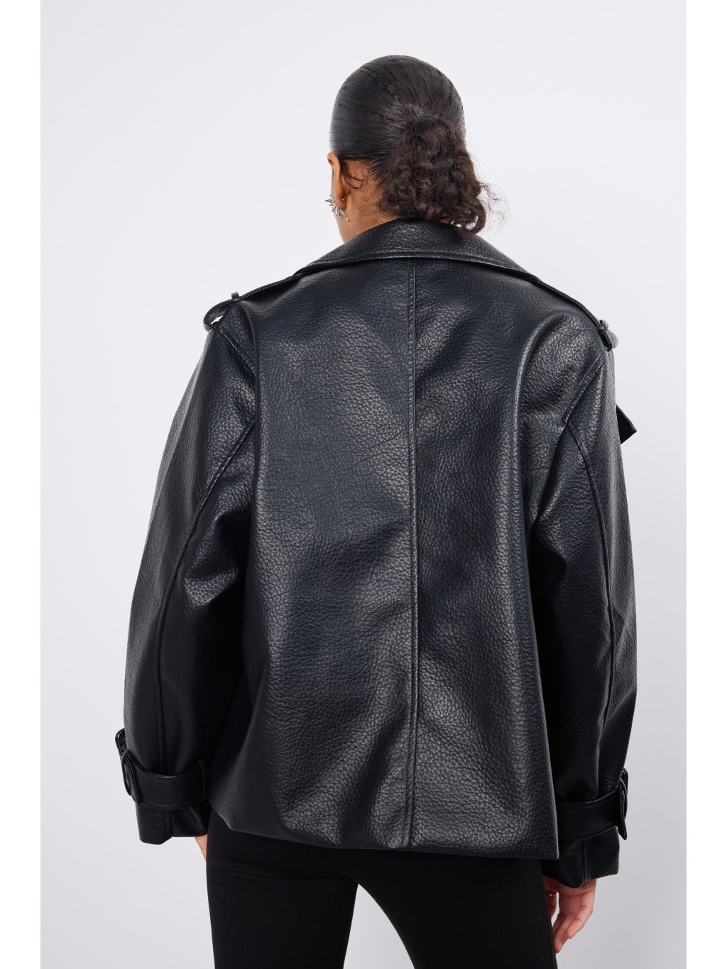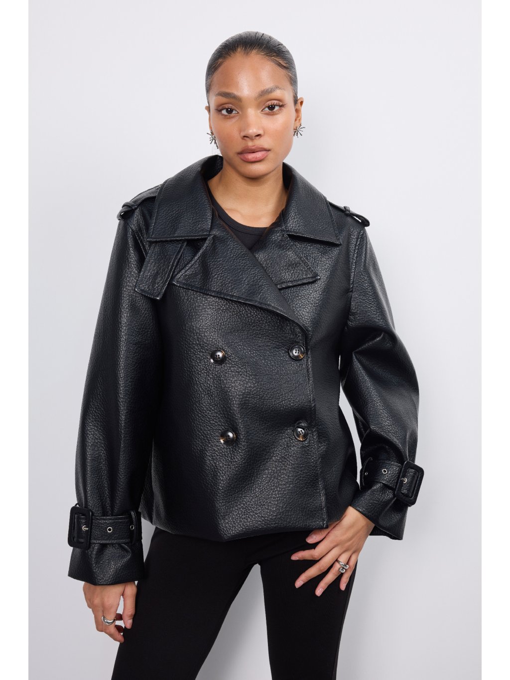 Dámska koženková bunda s jemnými vypchávkami na pleciach • materiál 100% polyester • model s podšívkou - 90,7% polyester, 5% viskóza, 4,3% bavlna • po oboch...