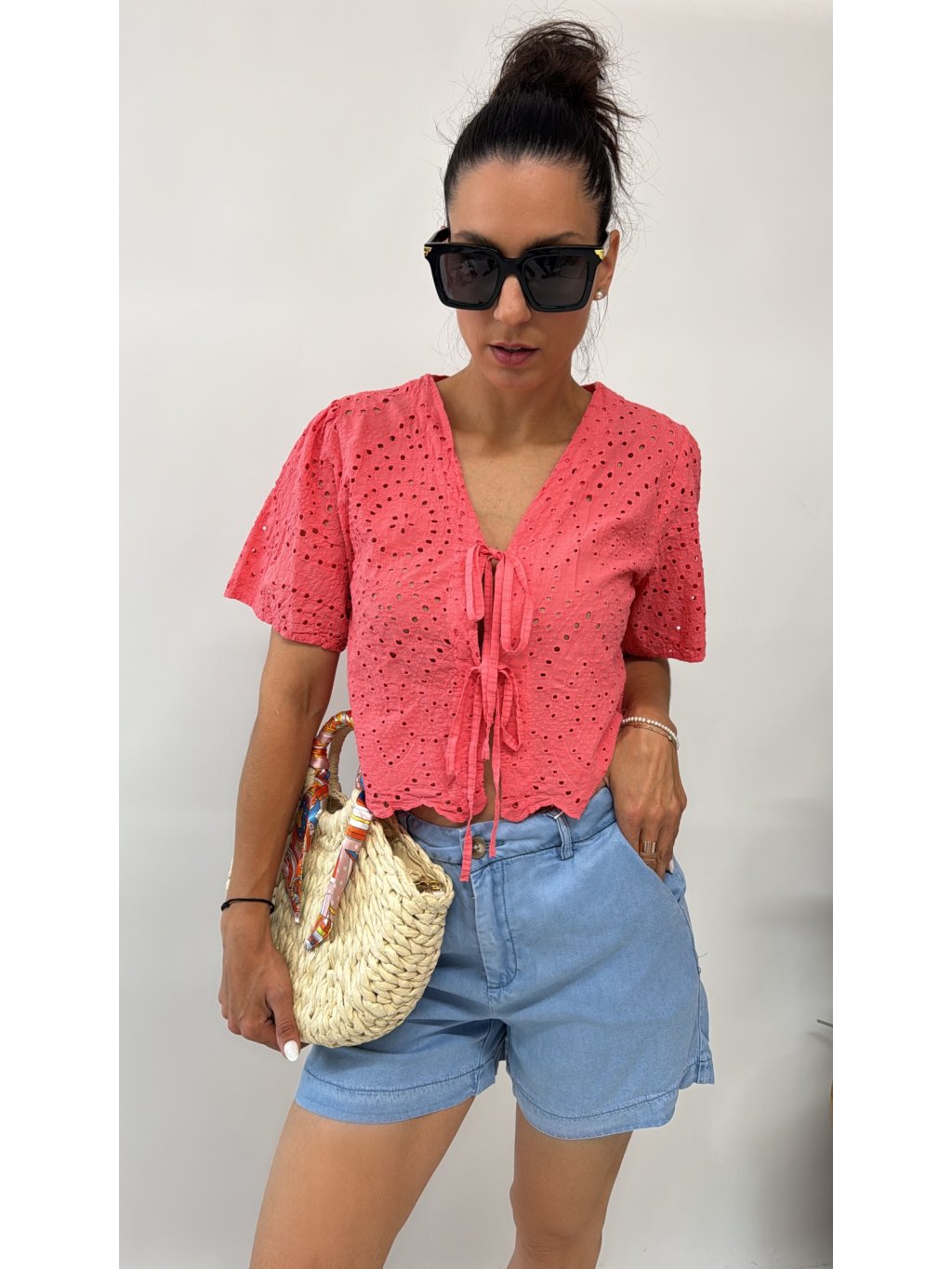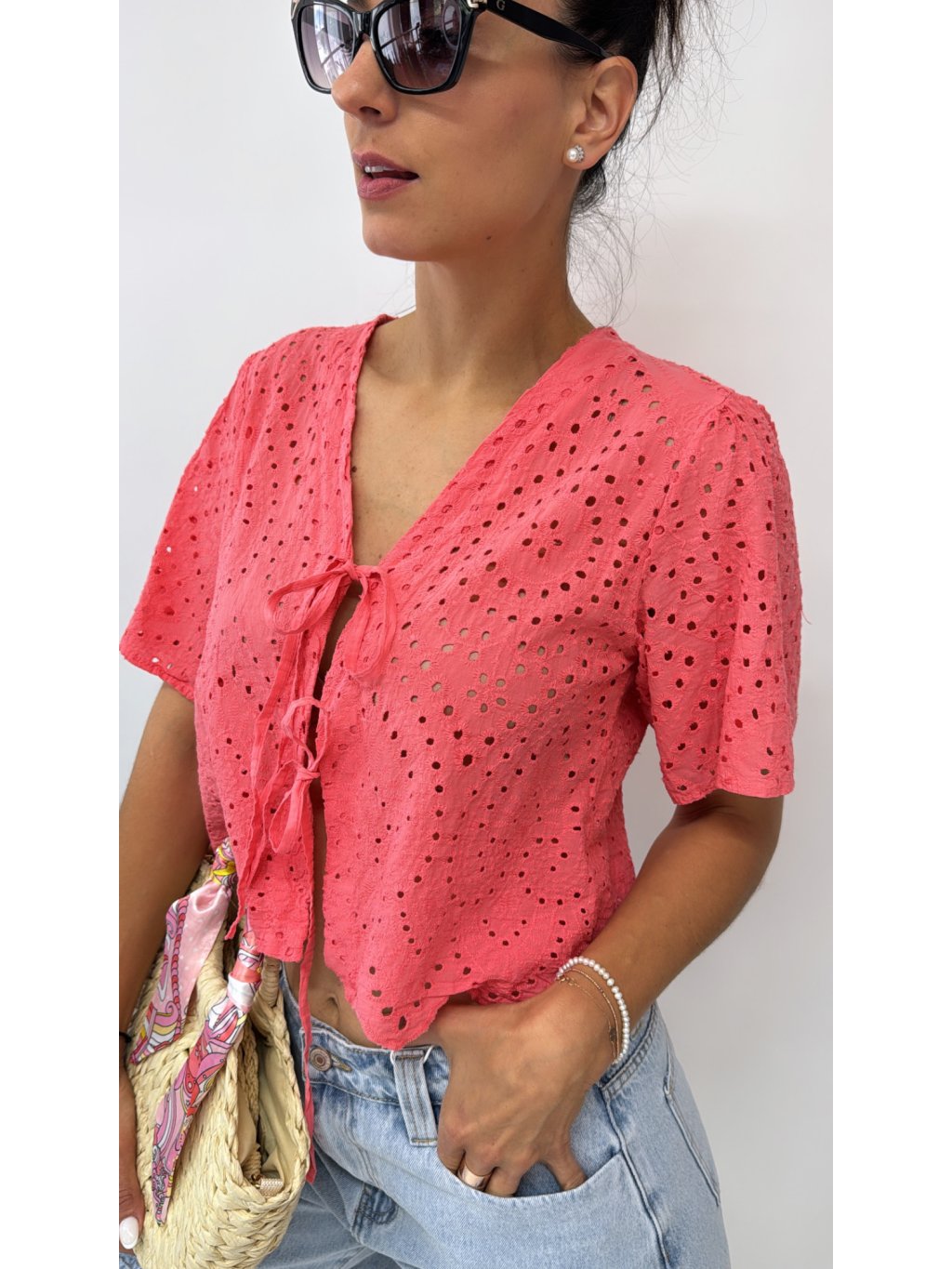 Dámska blúzka vo farbe fuchsia • materiál 85% polyester, 10% viskóza, 5% elastan • V - čkový výstrih • vzadu viazanie na šnúrku • v zadnej časti predĺžená • rukáv...
