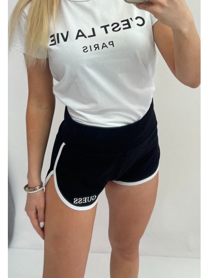 Dámske cyklošortky v svetlosivej farbe • materiál 55% bavlna, 8% elastan, 37% polyester• po bokoch nápis Guess