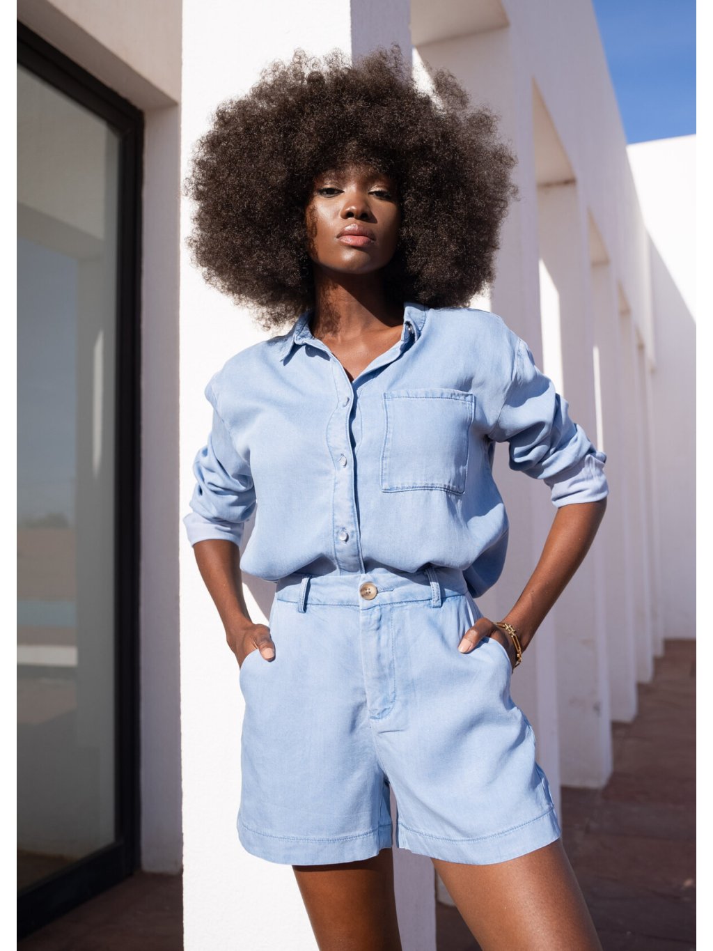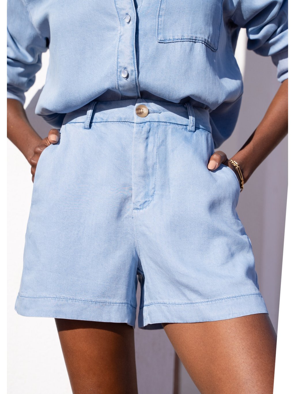 Dámske denimové šortky v bledomodrej farbe s kamienkami • materiál 100% bavlna • zapínanie na gombík a zips• vysoký pás • v prednej aj zadnej časti vrecká po...