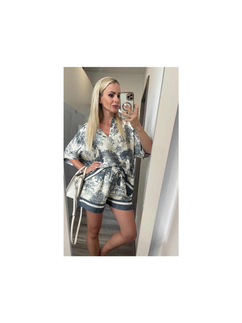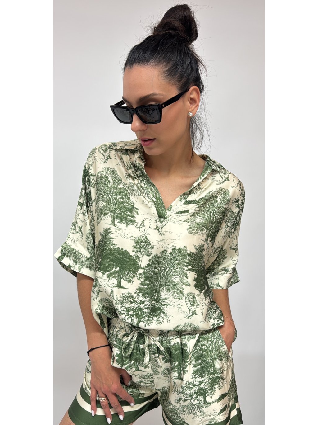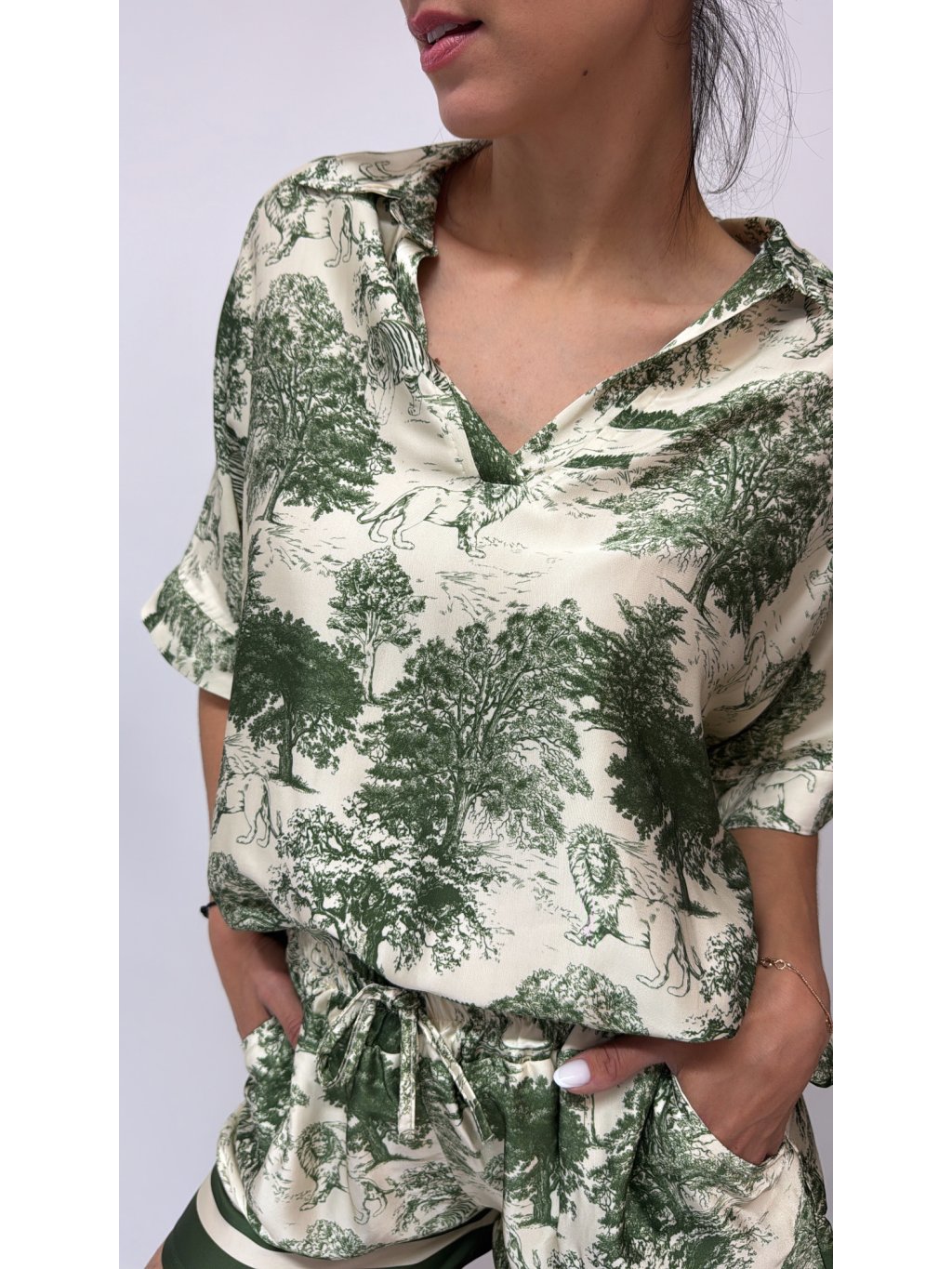 Dámsky komplet v UNI veľkosti • 2 - dielny komplet, šortky a košeľa • materiál 88% viskóza, 12% nylon • košeľa má zapínanie na gombíky• šortky v páse na gumu s...