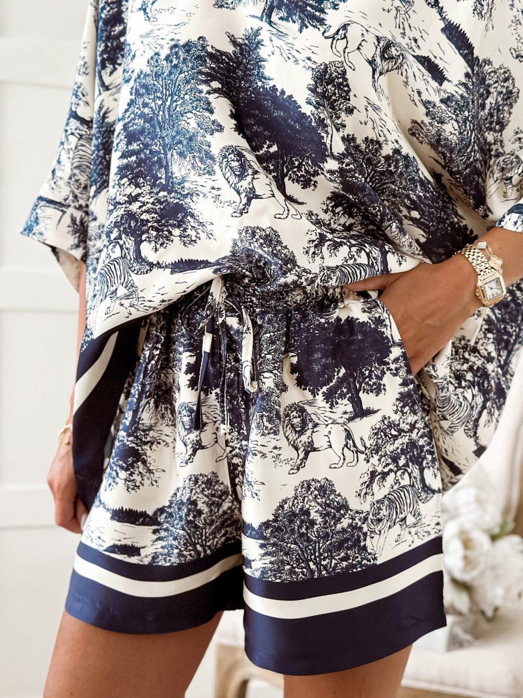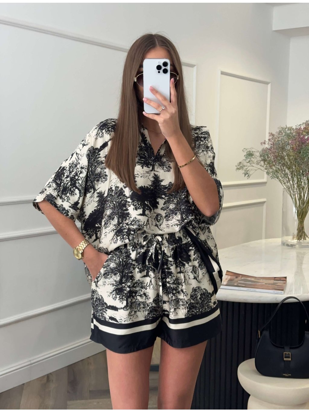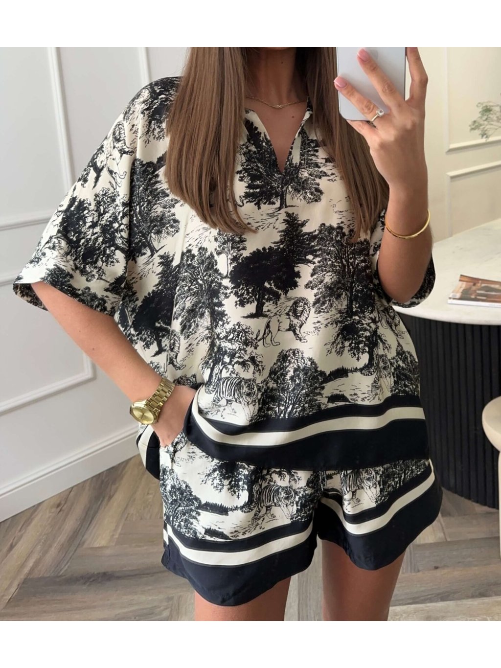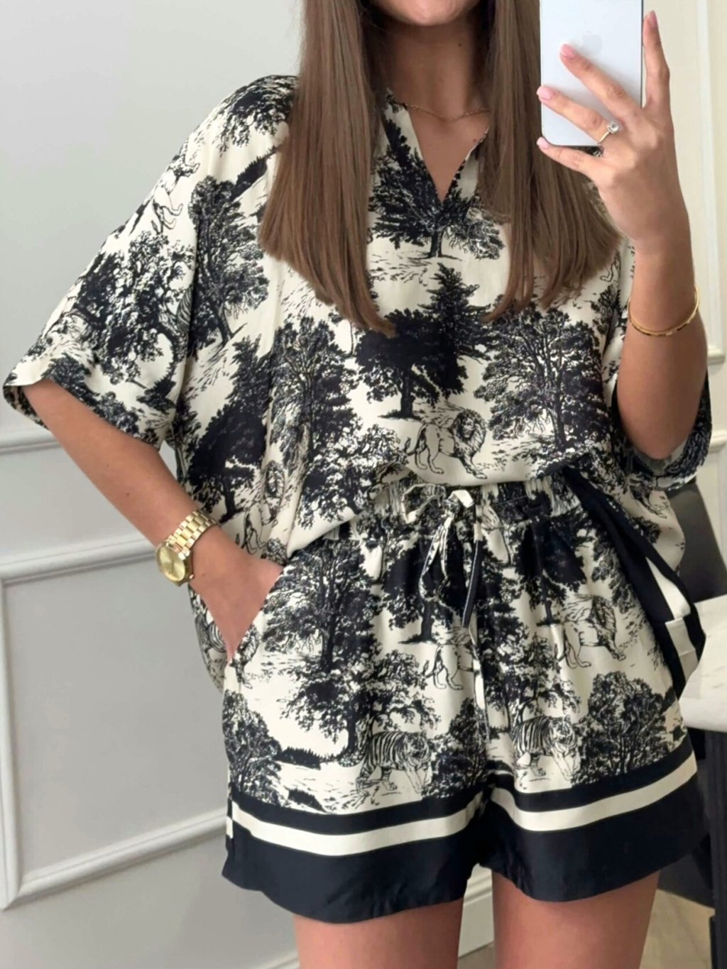 Dámsky komplet v UNI veľkosti • 2 - dielny komplet, šortky a košeľa • materiál 88% viskóza, 12% nylon • košeľa má zapínanie na gombíky• šortky v páse na gumu s...